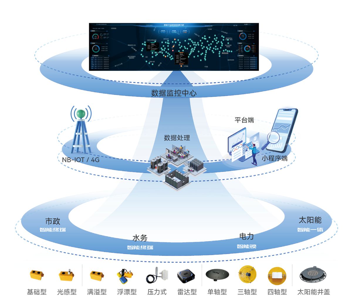 1.智慧基础设施体系:“物理基础”,负责数据采集、传输与存储,相当于城市的“神经网络”,分为三类:感知基础设施 \ 通信基础设施 \ 计算与存储基础设施。