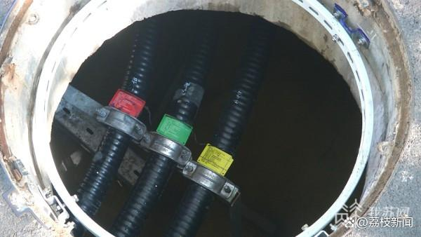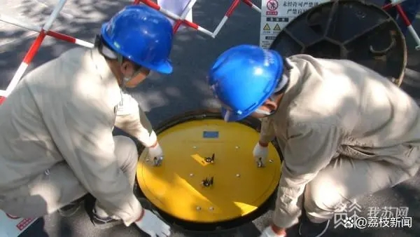 高压输电电缆入地之后,为了方便检修,供电公司会在沿线设立检修井。今天上午,记者在南京江北新华路附近的一处检修井看到,运维人员正在检查井盖,而这个井盖就是最新亮相的智能井盖。